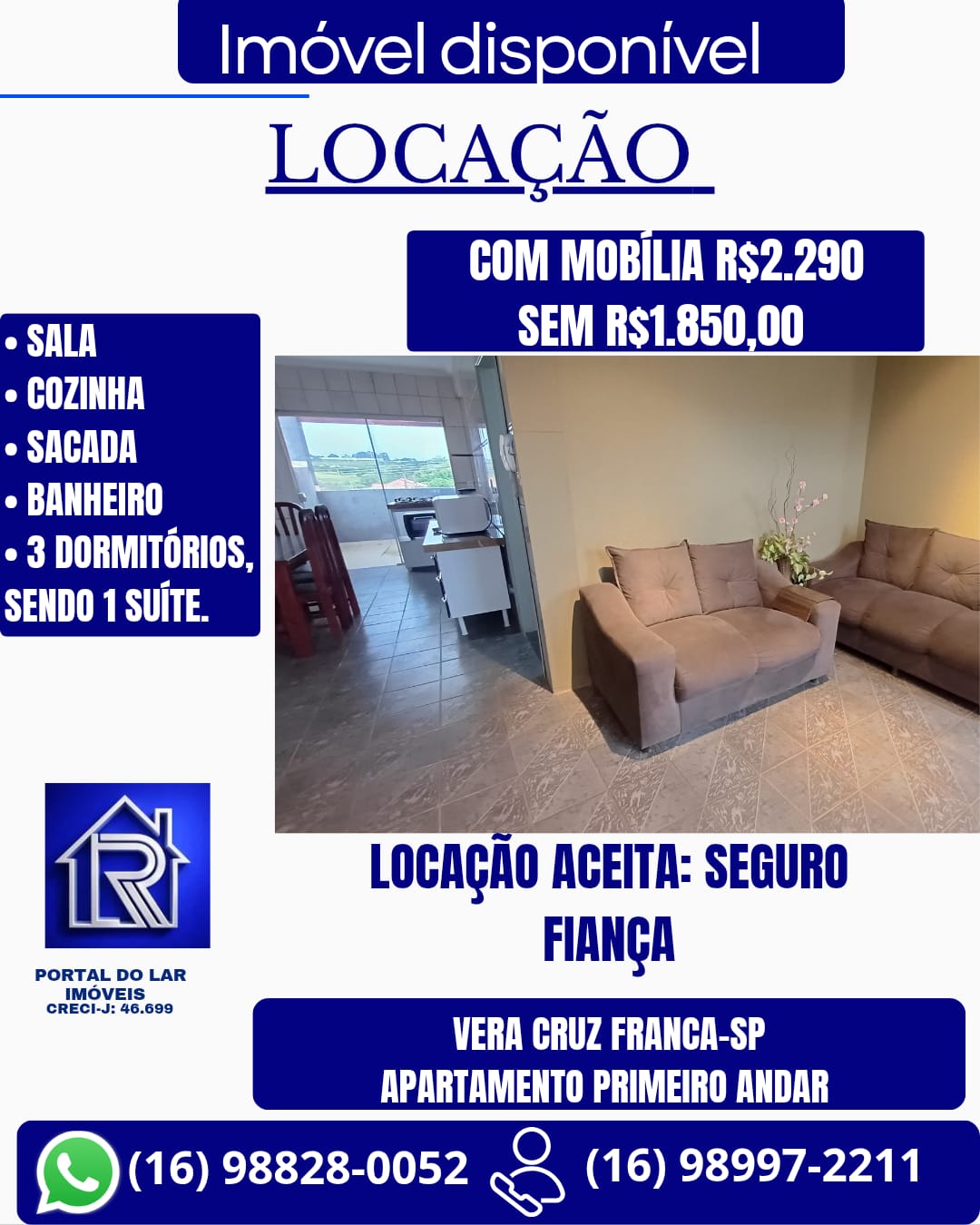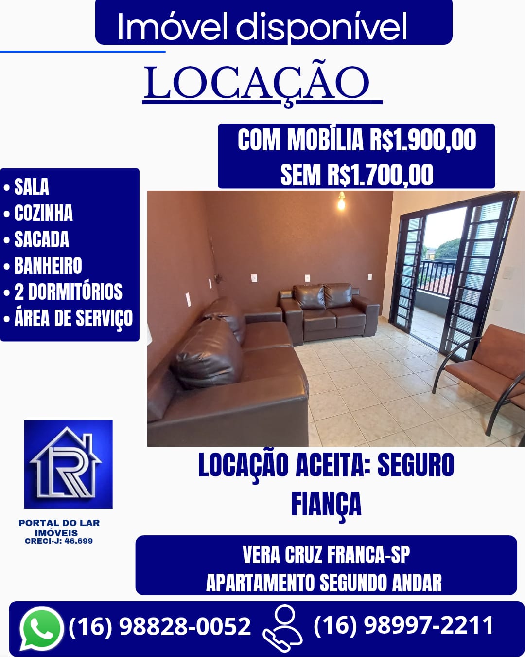 R$1.900,00 Com mobília R$1.700,00 Sem mobília